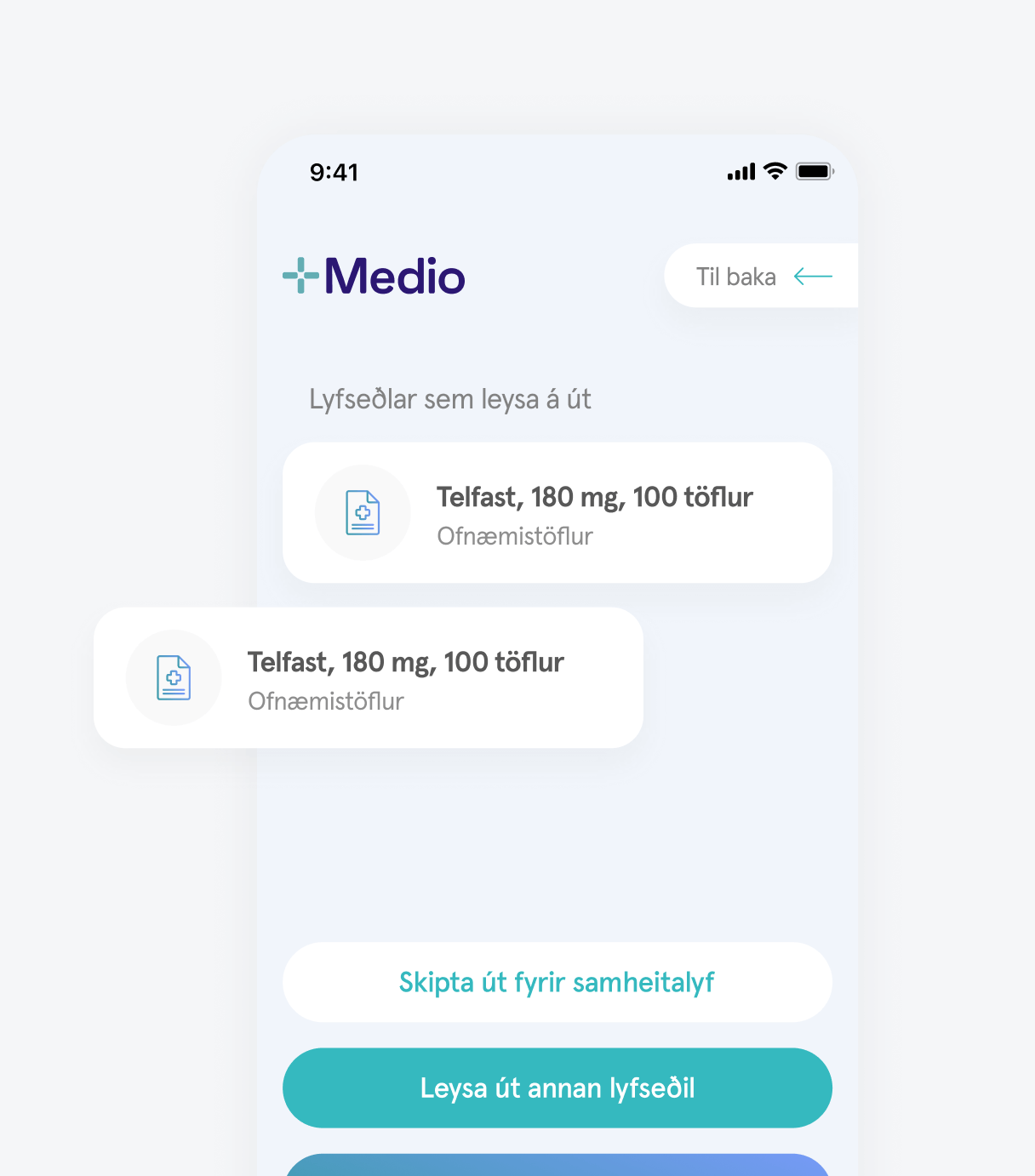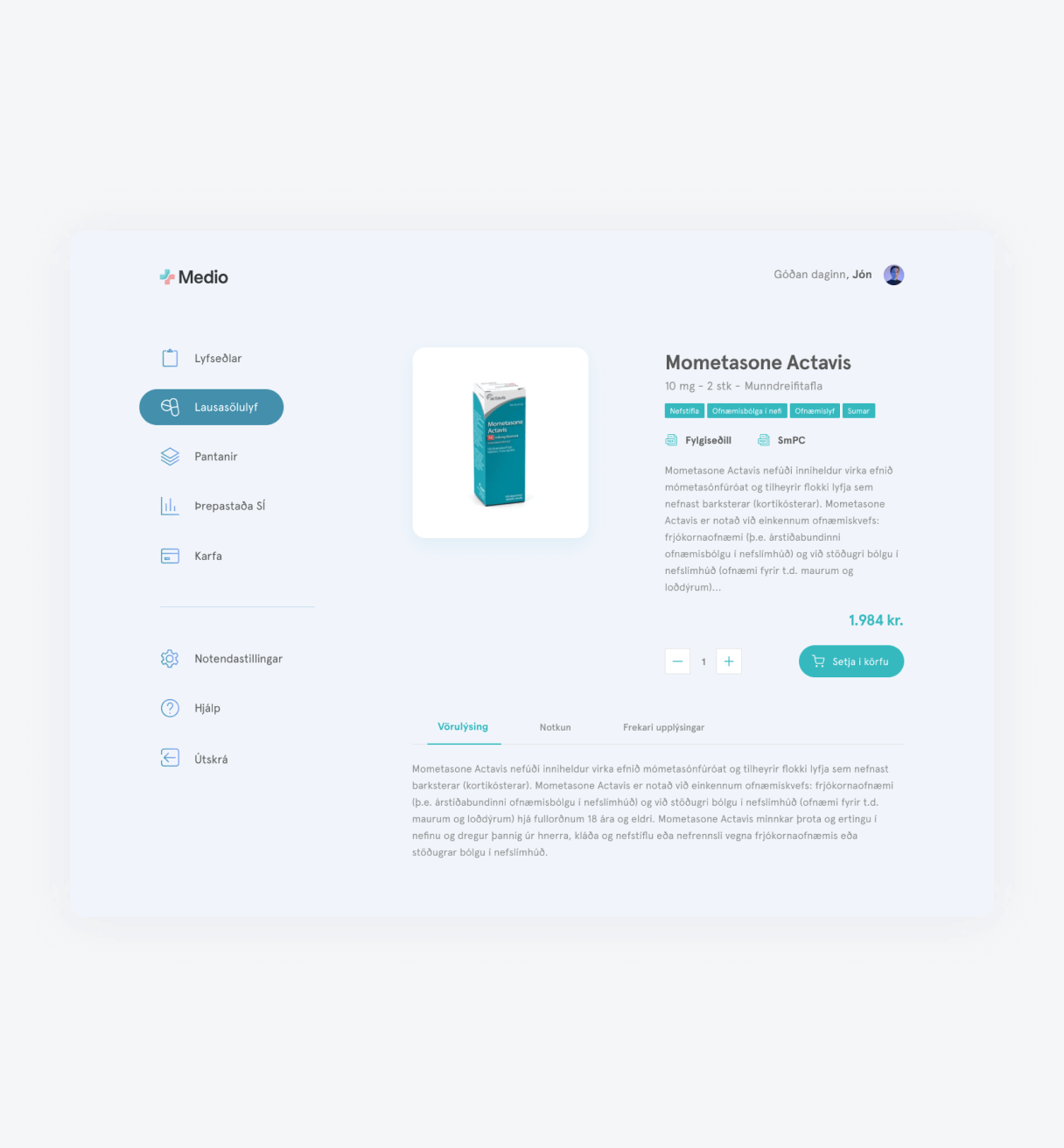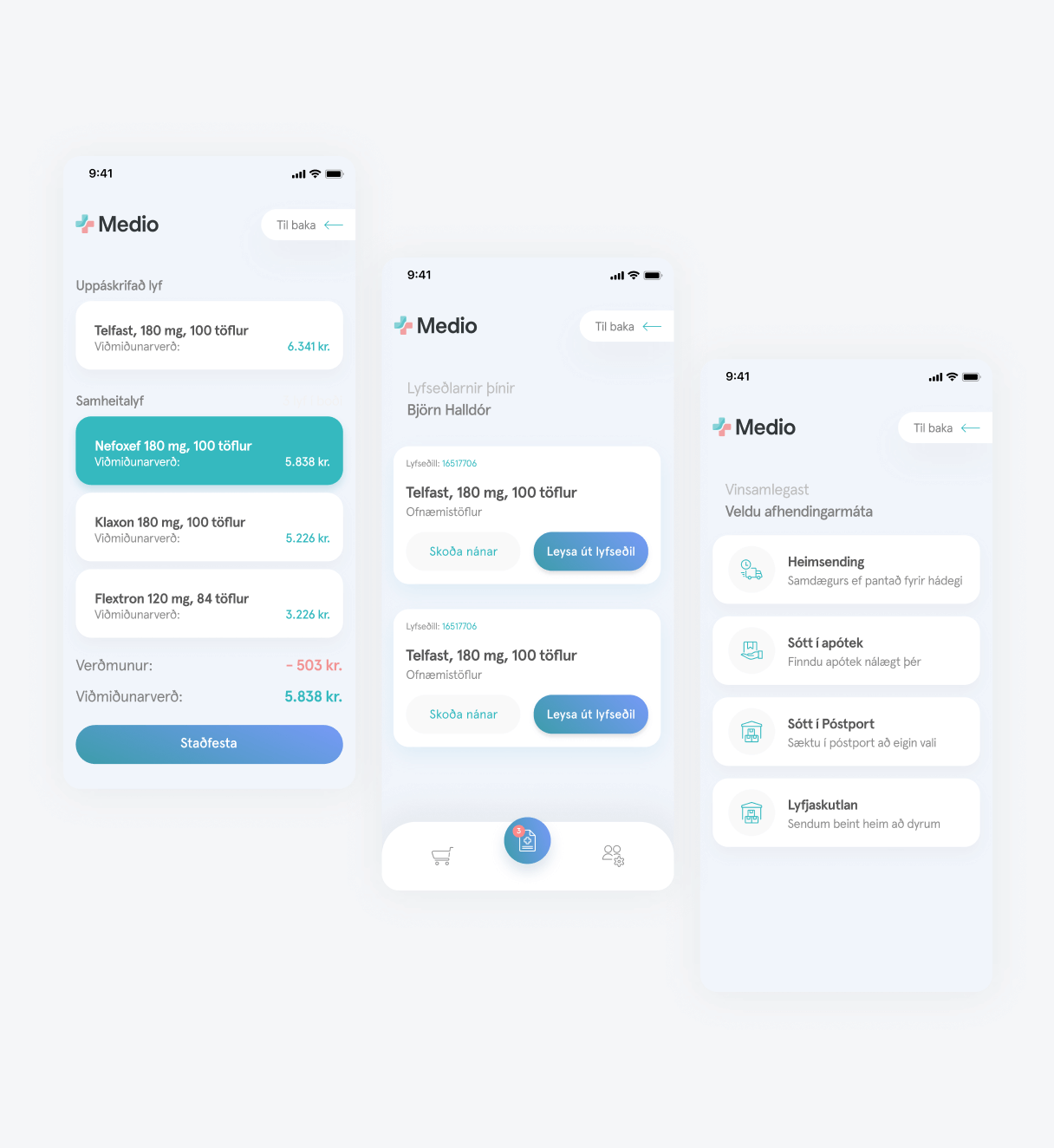- Við innskráningu notanda sækir Medio lyfseðla beint úr lyfseðlagátt.